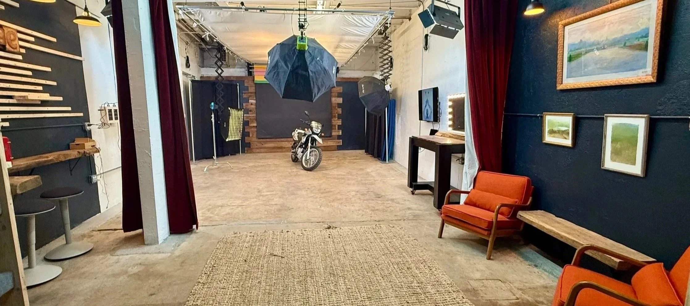 Provides the creator a flexible space to create. Dimensions are 14ft tall, 30ft wide, and 20ft deep. Option to drive a motorbike or small vehicle onto the set.